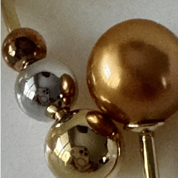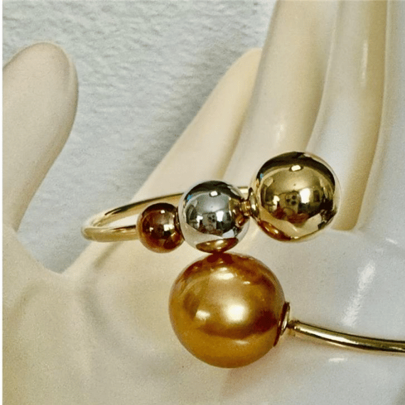 This stunning bangle is beautifully crafted from 14k gold, showcasing a striking design with 24k overtone Southsea pearls. The pearls, in a unique combination of gold, white gold, and rose gold, create a sophisticated and elegant appearance. Perfect for adding a touch of luxury and refinement to any outfit, this bangle is a timeless piece that complements both casual and formal styles.